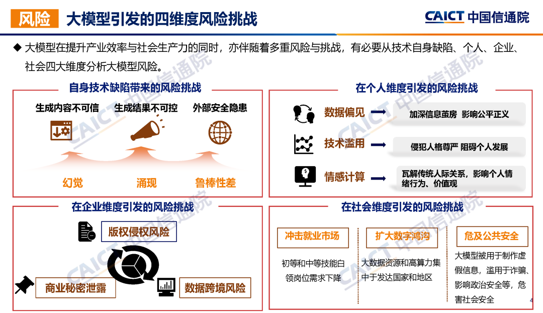 者”。技术变革的同时带来四维度风险挑战,大模型幻觉、涌现效应等加剧模型自身风险,大模型技术滥用、情感计算等侵犯个人人格尊严,大模型版权侵权、数据泄露等危及企业