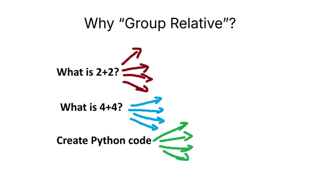 例如,对于「What is 2 + 2?」,我们采样 4 次。我们可能得到 4、3、D、C。然后,我们计算每个答案的奖励,计算平均奖励和标准差,最后用 Z 分数进行标准化!