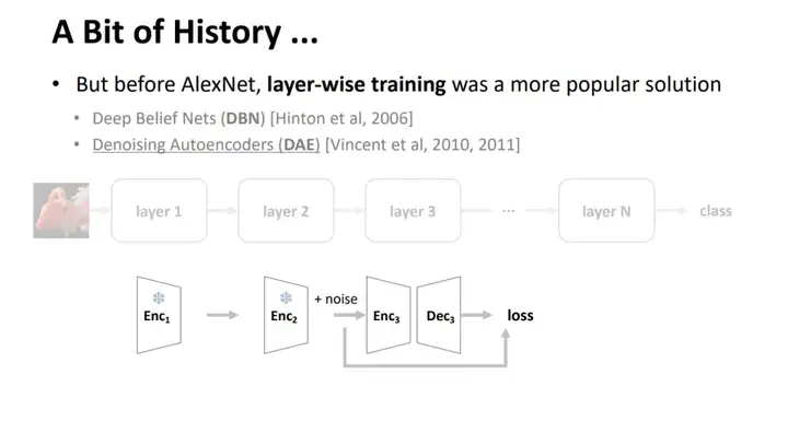 在 PPT 前几页,何恺明首先带大家回顾了识别模型(recognition model)的演进。在 AlexNet 之前,逐层训练更为流行,如深度信念网络(DBN)和去噪自编码器(DAE)。但 AlexNet 之后,识别模型普遍实现了端到端训练,大大简化了模型设计和训练的复杂性。