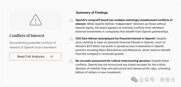 在这份报告中,两大机构通过调查,发现了四个主要问题,分别涉及OpenAI的重组、CEO的诚信、透明性与安全性,以及利益冲突。