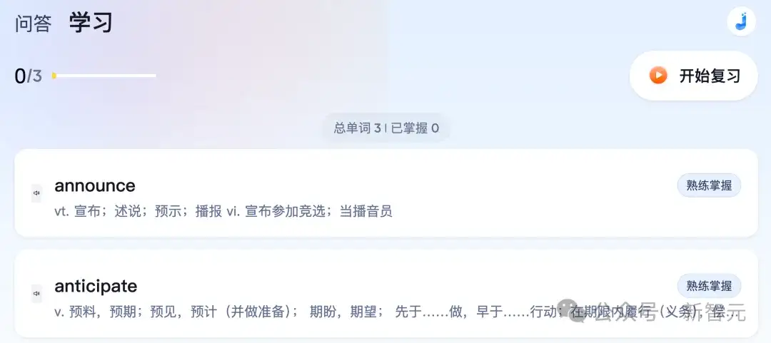 点击开始复习,就可以就可以进入学习界面,学习界面中有诸多功能帮助你巩固单词,比如补全单词和选择单词对应的中文释义。