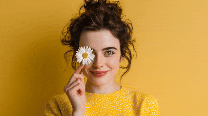 一位年轻女子用一朵雏菊遮住一只眼睛,站在柔和的黄色背景前,另一只眼睛带着顽皮的笑意。构图干净居中,色彩和谐,身后有柔和的阴影,一切设计都旨在让主体的动作和个性鲜明生动、令人难忘。